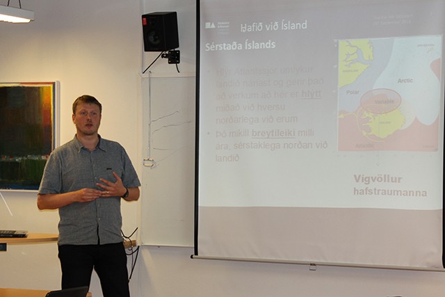 Í sjónum út af Norðurlandi mætast heitir og kaldir hafstraumar og það er misjafnt hve stórt svæði hvorir um sig ná yfir. Árferði í sjónum er mismunandi og stýrir fiskgengd á svæðinu. Ýsa og stór þorskur ganga til dæmis aðeins á miðin undan Norðurlandi á hlýskeiðum. Þetta sagði Valtýr Hreiðarsson, fiskifræðingur nemendum í Tröllaskagaáfanga í gær.